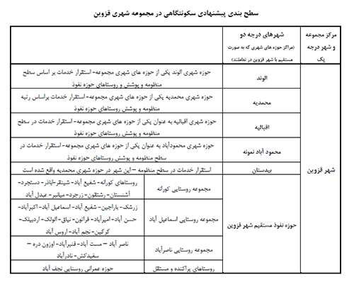 حوزه نفوذ شهر قزوين امروزه مجموعه اي است از چند شهر و کانون جمعيت بزرگ نزديک به هم که داراي ارتباط روزمره و متقابل و سرنوشت مشترک بوده و اجزاي يک مجموعه واحد را تشکيل ميدهند . در نقشه سطح بندي مجموعه شهري قزوين ، شهر قزوين به عنوان مرکز اصلي مجموعه شهري تعريف شده است . اين شهر به عنوان شهر درجه يک داراي نقش اصلي در مجموعه شهري قزوين بوده و ارائه کننده خدمات سطوح بالا ( از قبيل دانشگاه ، بيمارستان هاي تخصصي و ...) و ارتباط دهنده شهر هاي پيراموني مي باشد .